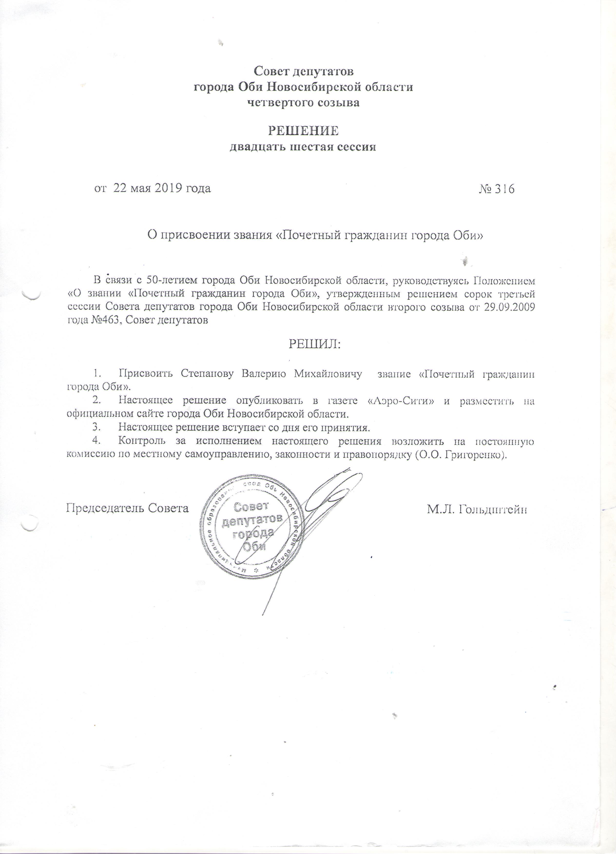 22.05.2019 № 316 о присвоении звания "Почетный гражданин города Оби"